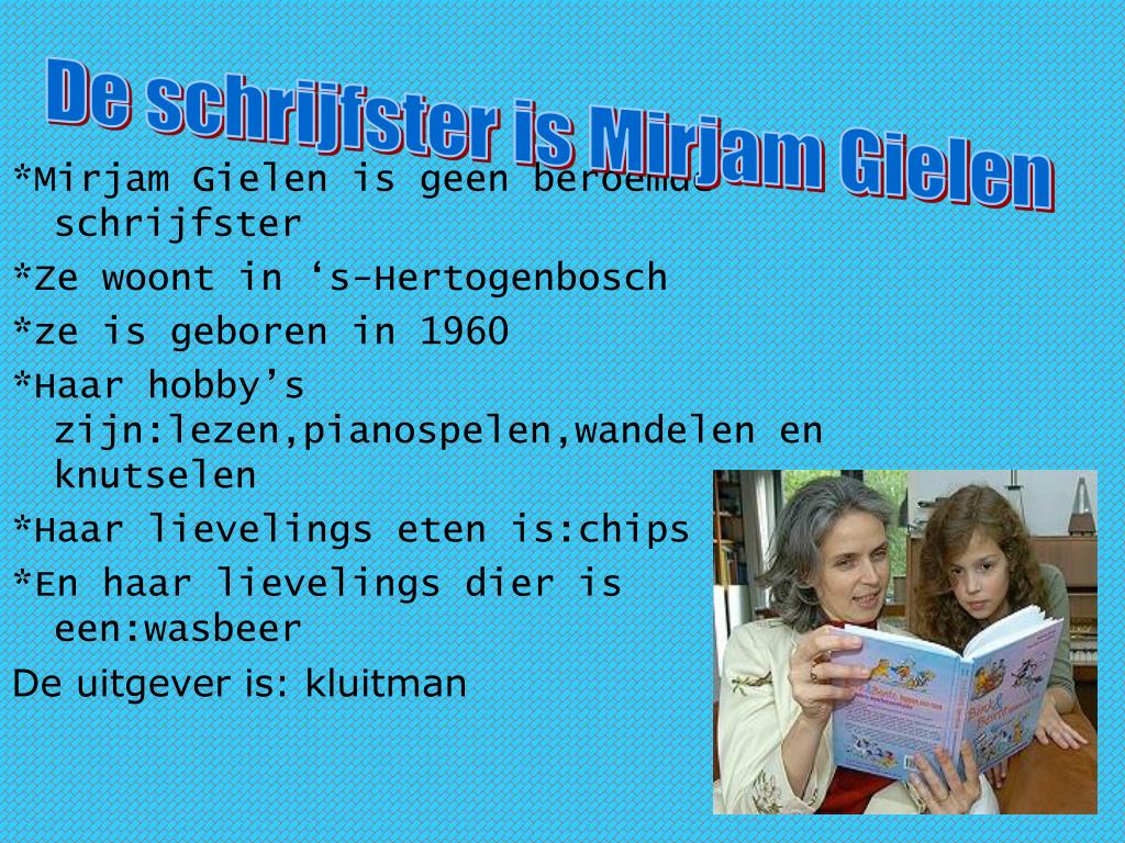 De schrijfster is Mirjam Gielen *Mirjam Gielen is geen beroemde schrijfster *Ze woont in ‘s-Hertogenbosch *ze is geboren in 1960 *Haar hobby’s zijn:lezen,pianospelen,wandelen en knutselen *Haar lievelings eten is:chips *En haar lievelings dier is een:wasbeer De uitgever is: kluitman