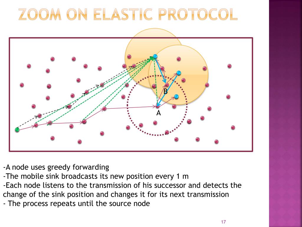Zoom on ELASTIC protocol B A • -A node uses greedy forwarding • -The mobile sink broadcasts its new position every 1 m • Each node listens to the transmission of his successor and detects the change of the sink position and changes it for its next transmission • The process repeats until the source node