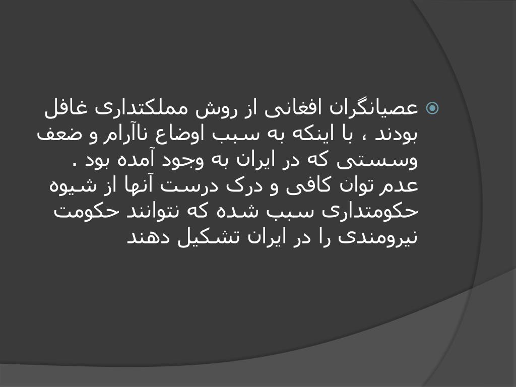عصیانگران افغانی از روش مملکتداری غافل بودند ، با اینکه به سبب اوضاع ناآرام و ضعف وسستی که در ایران به وجود آمده بود . عدم توان کافی و درک درست آنها از شیوه حکومتداری سبب شده که نتوانند حکومت نیرومندی را در ایران تشکیل دهند
