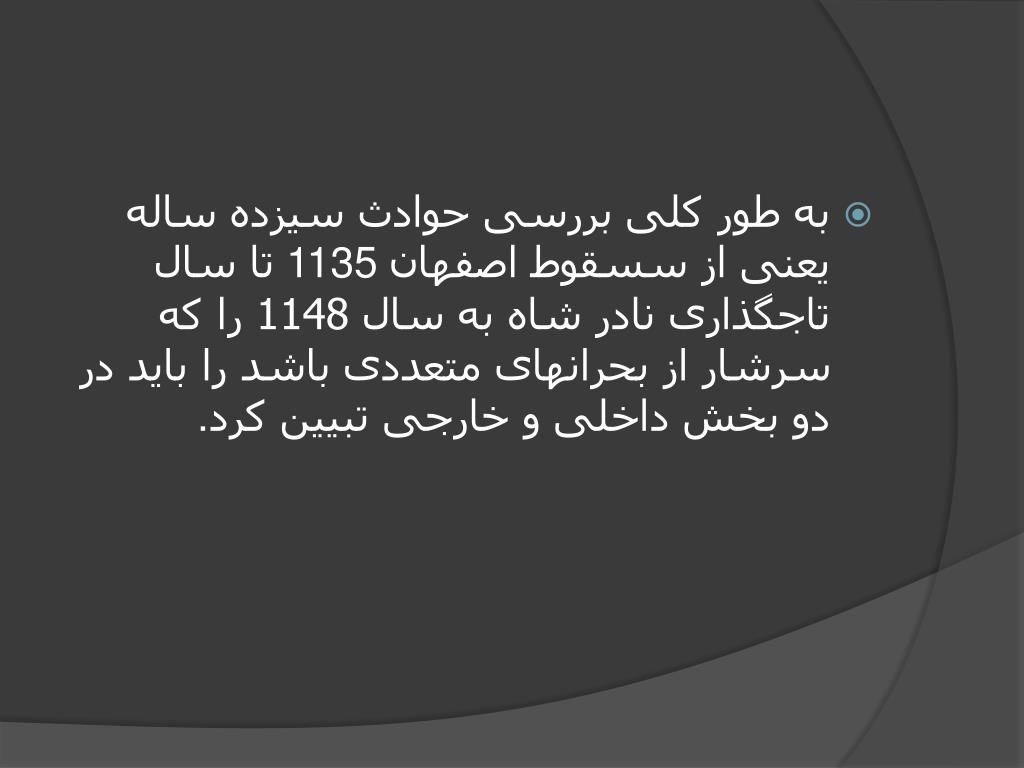 به طور کلی بررسی حوادث سیزده ساله یعنی از سسقوط اصفهان 1135 تا سال تاجگذاری نادر شاه به سال 1148 را که سرشار از بحرانهای متعددی باشد را باید در دو بخش داخلی و خارجی تبیین کرد .