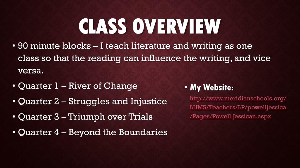 Class Overview • 90 minute blocks – I teach literature and writing as one class so that the reading can influence the writing, and vice versa. • Quarter 1 – River of Change • Quarter 2 – Struggles and Injustice • Quarter 3 – Triumph over Trials • Quarter 4 – Beyond the Boundaries • My Website: http://www.meridianschools.org/LHMS/Teachers/LP/powelljessica/Pages/Powell,Jessican.aspx