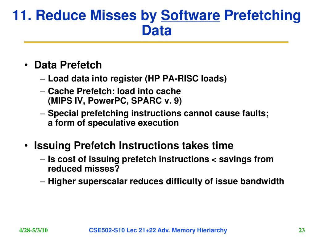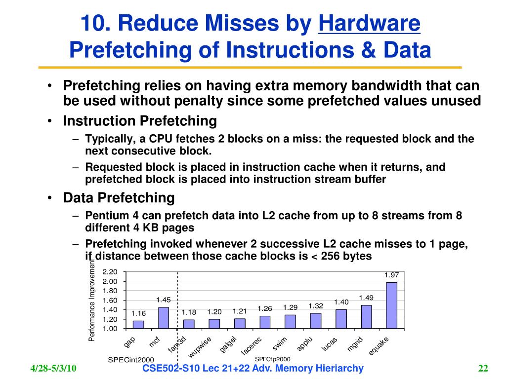 10. Reduce Misses by Hardware Prefetching of Instructions & Data • Prefetching relies on having extra memory bandwidth that can be used without penalty since some prefetched values unused • Instruction Prefetching • Typically, a CPU fetches 2 blocks on a miss: the requested block and the next consecutive block. • Requested block is placed in instruction cache when it returns, and prefetched block is placed into instruction stream buffer • Data Prefetching • Pentium 4 can prefetch data into L2 cache from up to 8 streams from 8 different 4 KB pages • Prefetching invoked whenever 2 successive L2 cache misses to 1 page, if distance between those cache blocks is < 256 bytes CSE502-S10 Lec 21+22 Adv. Memory Hieriarchy