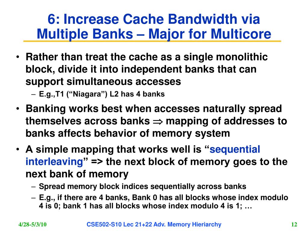 6: Increase Cache Bandwidth via Multiple Banks – Major for Multicore • Rather than treat the cache as a single monolithic block, divide it into independent banks that can support simultaneous accesses • E.g.,T1 (“Niagara”) L2 has 4 banks • Banking works best when accesses naturally spread themselves across banks mapping of addresses to banks affects behavior of memory system • A simple mapping that works well is “sequential interleaving” => the next block of memory goes to the next bank of memory • Spread memory block indices sequentially across banks • E.g., if there are 4 banks, Bank 0 has all blocks whose index modulo 4 is 0; bank 1 has all blocks whose index modulo 4 is 1; … CSE502-S10 Lec 21+22 Adv. Memory Hieriarchy