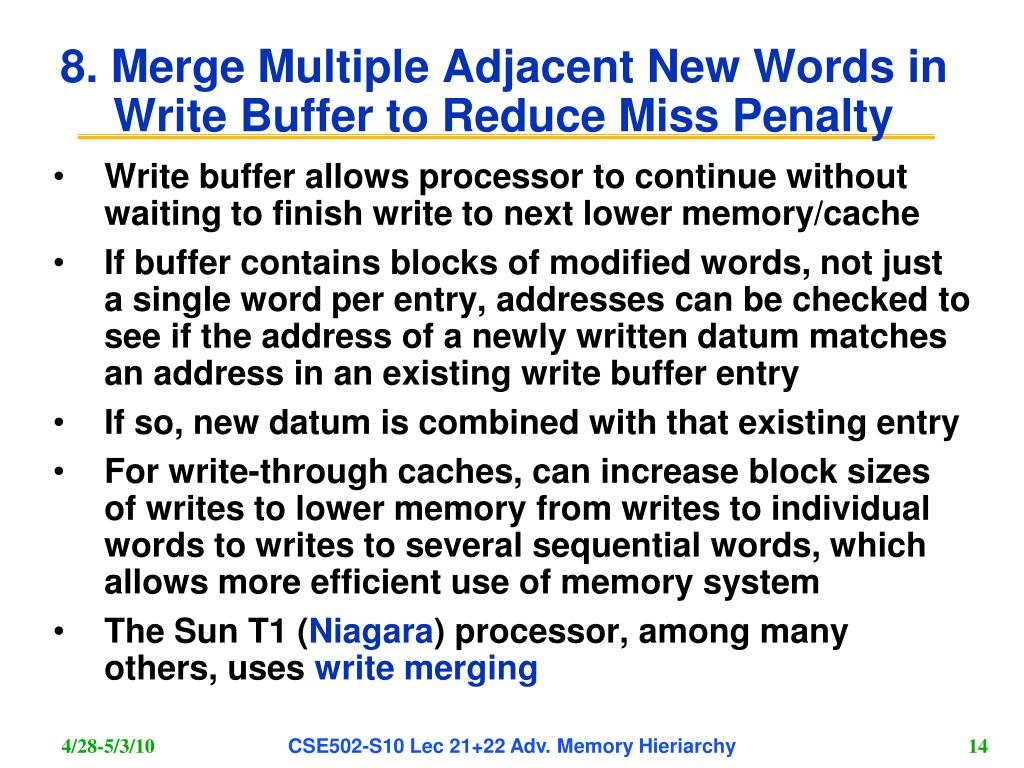 8. Merge Multiple Adjacent New Words in Write Buffer to Reduce Miss Penalty • Write buffer allows processor to continue without waiting to finish write to next lower memory/cache • If buffer contains blocks of modified words, not just a single word per entry, addresses can be checked to see if the address of a newly written datum matches an address in an existing write buffer entry • If so, new datum is combined with that existing entry • For write-through caches, can increase block sizes of writes to lower memory from writes to individual words to writes to several sequential words, which allows more efficient use of memory system • The Sun T1 (Niagara) processor, among many others, uses write merging CSE502-S10 Lec 21+22 Adv. Memory Hieriarchy