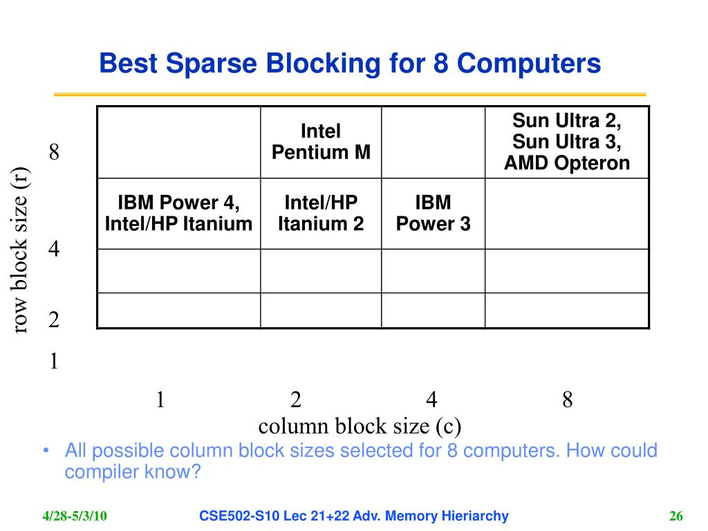 Best Sparse Blocking for 8 Computers • All possible column block sizes selected for 8 computers. How could compiler know? 8 4 row block size (r) 2 1 1 2 4 8 column block size (c) CSE502-S10 Lec 21+22 Adv. Memory Hieriarchy
