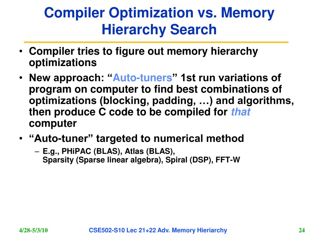 Compiler Optimization vs. Memory Hierarchy Search • Compiler tries to figure out memory hierarchy optimizations • New approach: “Auto-tuners” 1st run variations of program on computer to find best combinations of optimizations (blocking, padding, …) and algorithms, then produce C code to be compiled for that computer • “Auto-tuner” targeted to numerical method • E.g., PHiPAC (BLAS), Atlas (BLAS), Sparsity (Sparse linear algebra), Spiral (DSP), FFT-W CSE502-S10 Lec 21+22 Adv. Memory Hieriarchy