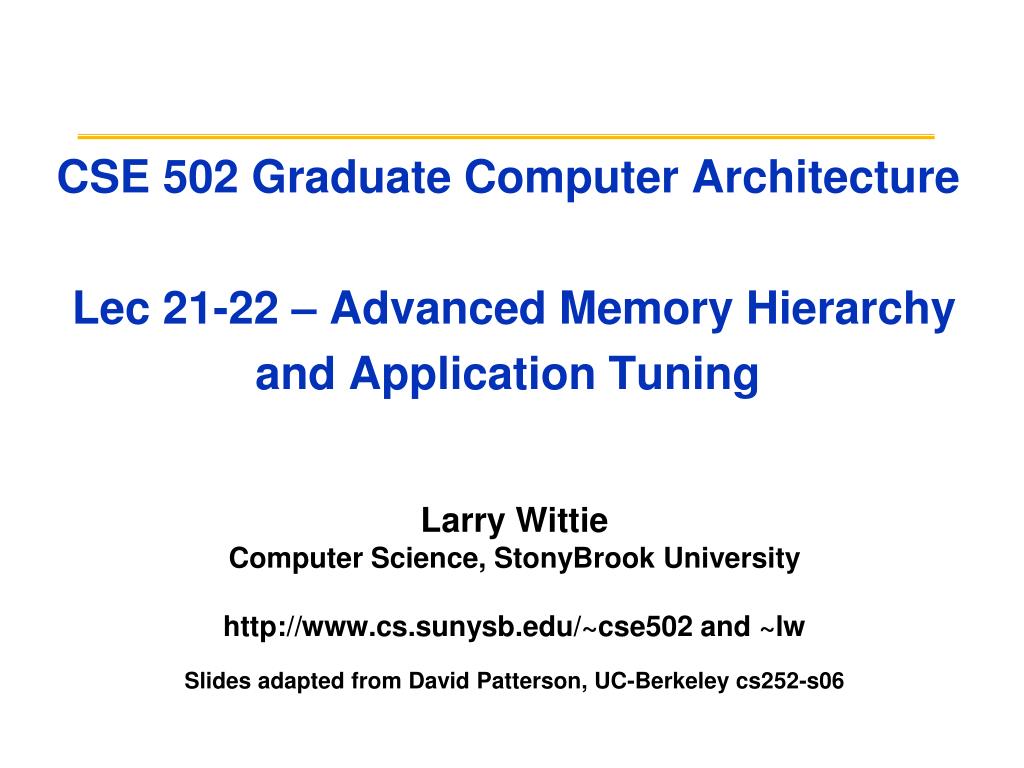 CSE 502 Graduate Computer Architecture Lec 21-22 – Advanced Memory Hierarchy and Application Tuning. Larry Wittie Computer Science, StonyBrook University http://www.cs.sunysb.edu/~cse502 and ~lw Slides adapted from David Patterson, UC-Berkeley cs252-s06. Outline.