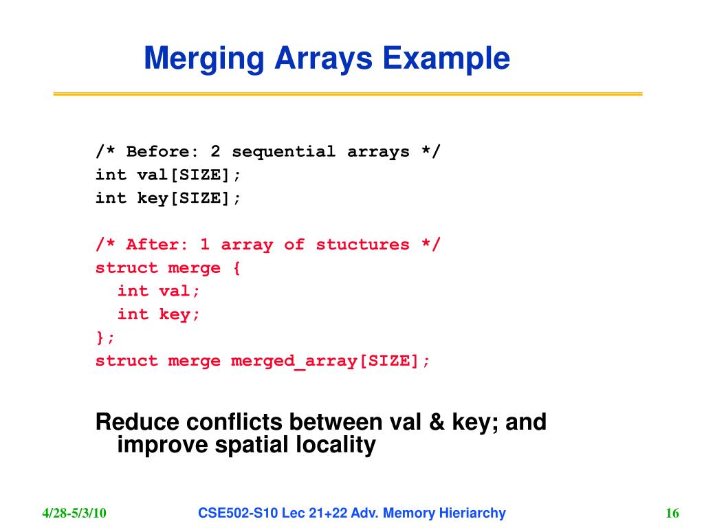 Merging Arrays Example /* Before: 2 sequential arrays */ int val[SIZE]; int key[SIZE]; /* After: 1 array of stuctures */ struct merge { int val; int key; }; struct merge merged_array[SIZE]; Reduce conflicts between val & key; and improve spatial locality CSE502-S10 Lec 21+22 Adv. Memory Hieriarchy
