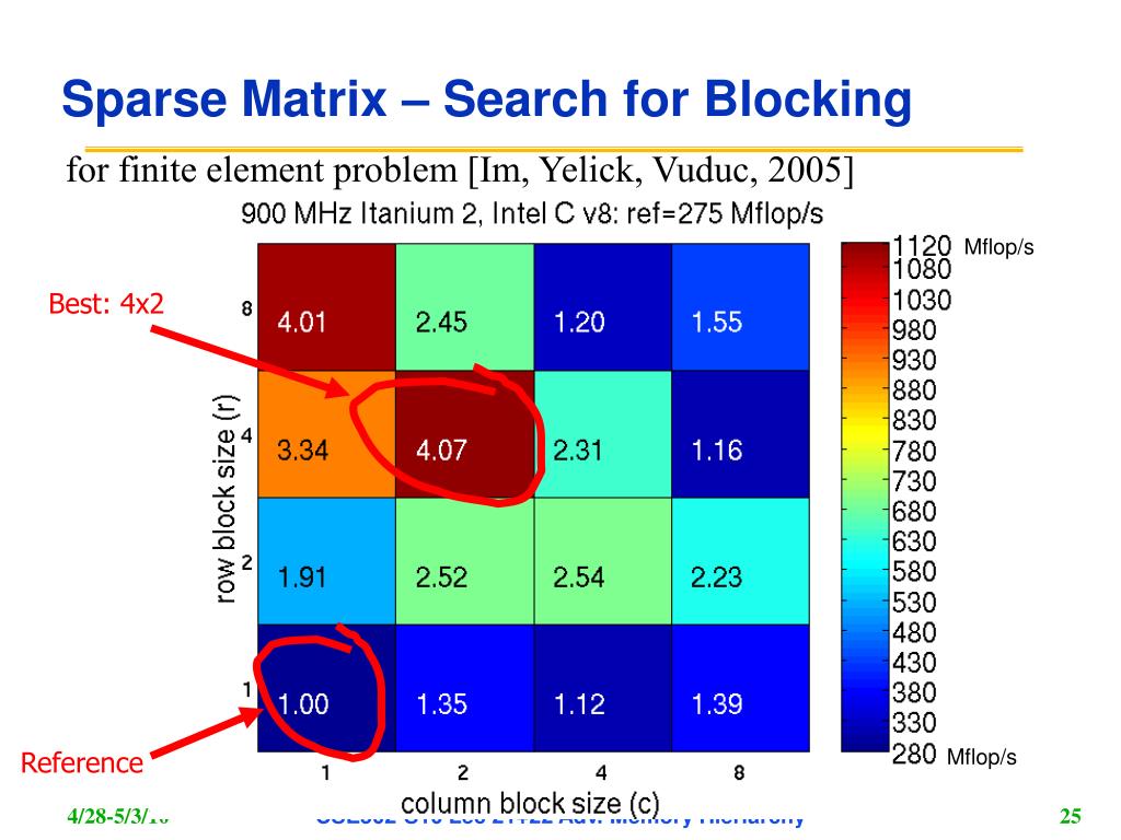 Mflop/s Best: 4x2 Reference Mflop/s Sparse Matrix – Search for Blocking for finite element problem [Im, Yelick, Vuduc, 2005] CSE502-S10 Lec 21+22 Adv. Memory Hieriarchy