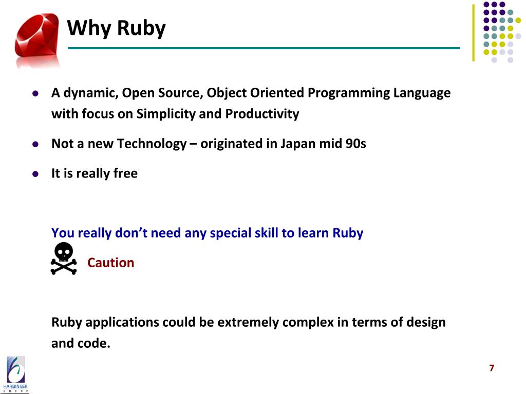 Why Ruby • A dynamic, Open Source, Object Oriented Programming Language with focus on Simplicity and Productivity • Not a new Technology – originated in Japan mid 90s • It is really free You really don’t need any special skill to learn Ruby Caution Ruby applications could be extremely complex in terms of design and code.