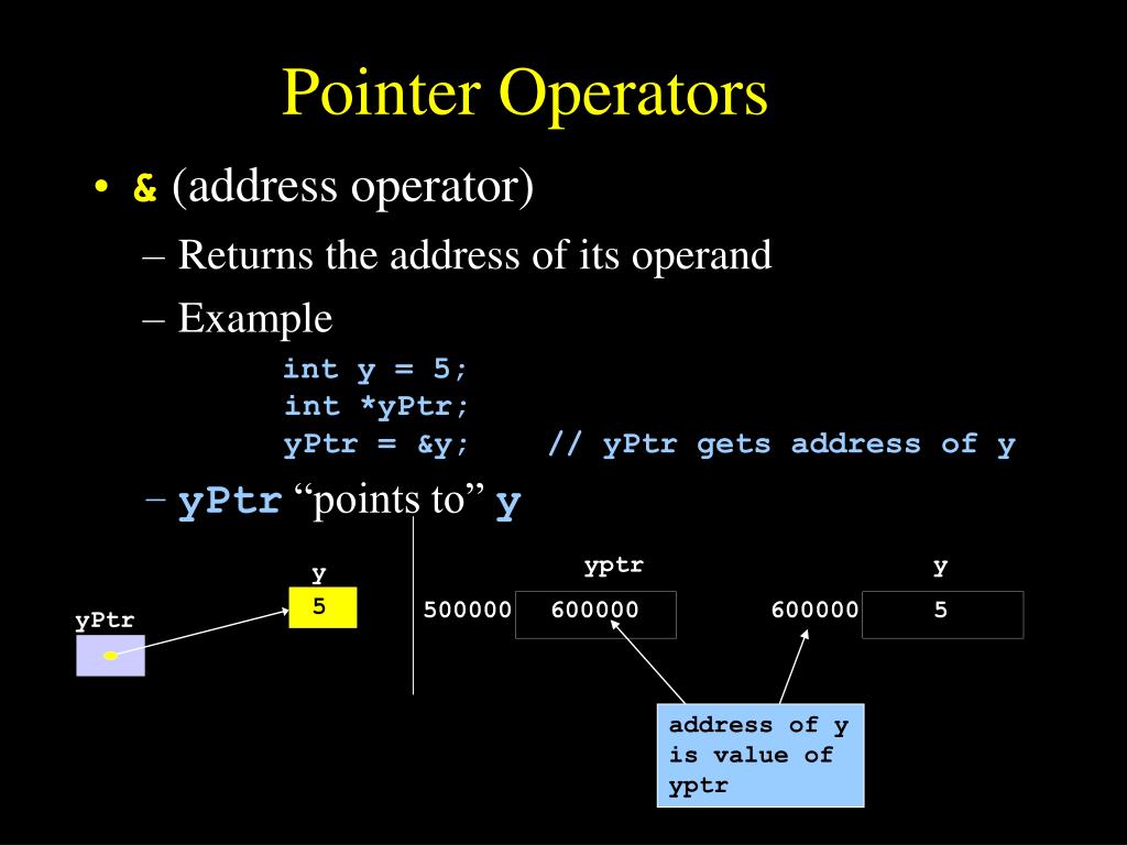 yptr y y 5 500000 600000 600000 5 yPtr address of y is value of yptr Pointer Operators • & (address operator) • Returns the address of its operand • Example int y = 5;int *yPtr;yPtr = &y; // yPtr gets address of y • yPtr “points to” y