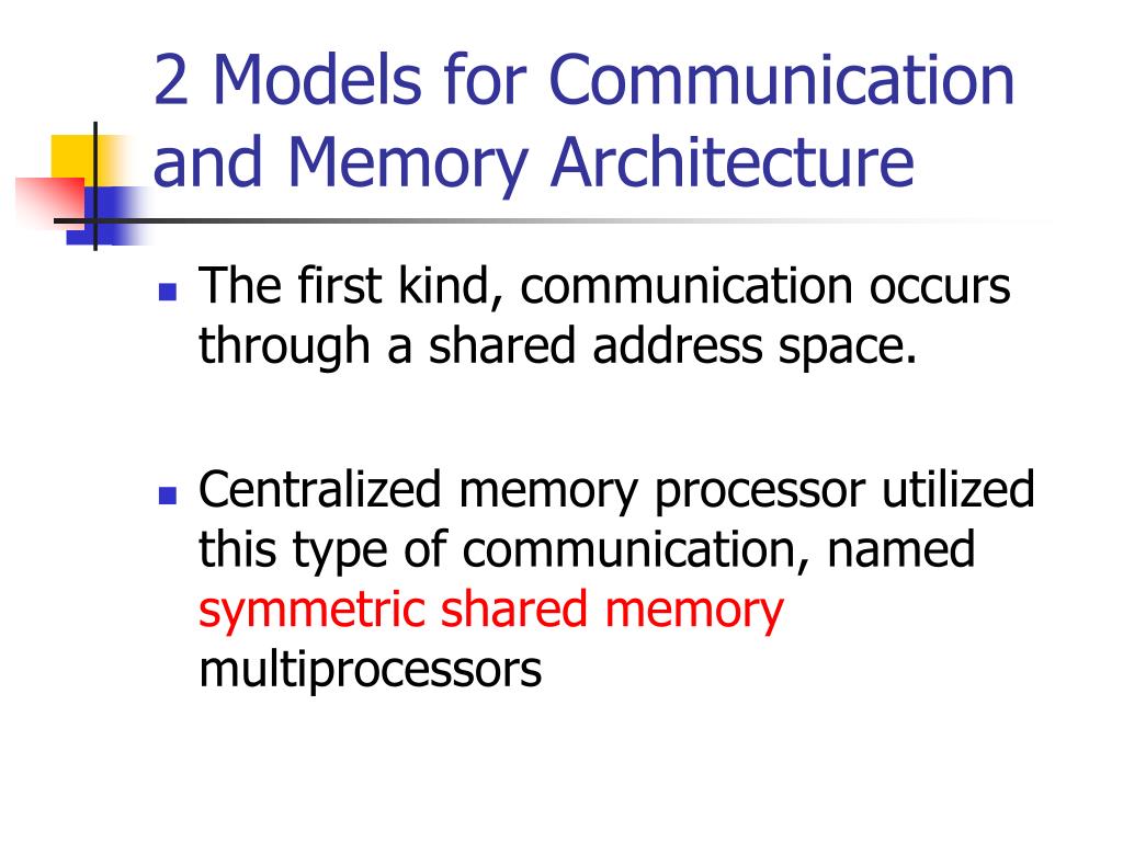 2 Models for Communication and Memory Architecture • The first kind, communication occurs through a shared address space. • Centralized memory processor utilized this type of communication, named symmetric shared memory multiprocessors