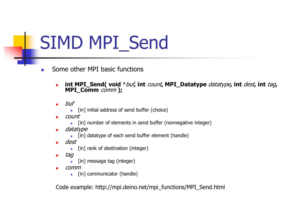 SIMD MPI_Send • Some other MPI basic functions • int MPI_Send(void *buf,intcount,MPI_Datatypedatatype,intdest,inttag,MPI_Commcomm); • buf • [in] initial address of send buffer (choice) • count • [in] number of elements in send buffer (nonnegative integer) • datatype • [in] datatype of each send buffer element (handle) • dest • [in] rank of destination (integer) • tag • [in] message tag (integer) • comm • [in] communicator (handle) Code example: http://mpi.deino.net/mpi_functions/MPI_Send.html