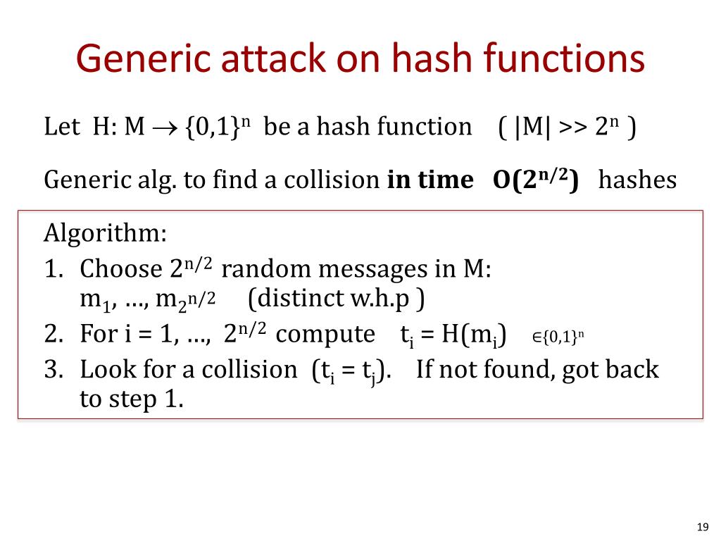 Generic attack on hash functions Let H: M {0,1}nbe a hash function ( |M| >> 2n ) Generic alg. to find a collision in time O(2n/2) hashes Algorithm: • Choose 2n/2random messages in M: m1, …, m2n/2 (distinct w.h.p ) • For i = 1, …, 2n/2 compute ti = H(mi) ∈{0,1}n • Look for a collision (ti = tj). If not found, got back to step 1. How well will this work?