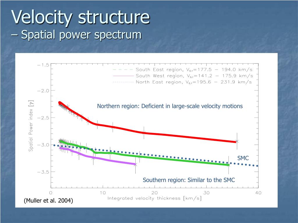 Northern region: Deficient in large-scale velocity motions SMC Southern region: Similar to the SMC Velocity structure – Spatial power spectrum (Muller et al. 2004)