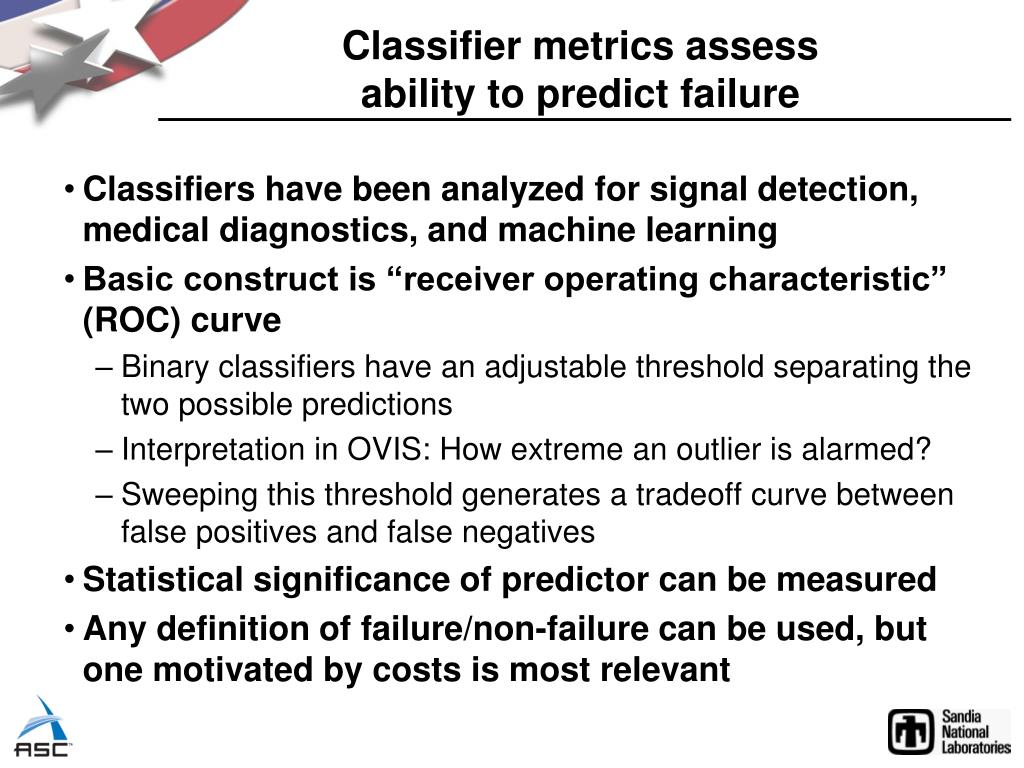 Classifier metrics assessability to predict failure • Classifiers have been analyzed for signal detection, medical diagnostics, and machine learning • Basic construct is “receiver operating characteristic” (ROC) curve • Binary classifiers have an adjustable threshold separating the two possible predictions • Interpretation in OVIS: How extreme an outlier is alarmed? • Sweeping this threshold generates a tradeoff curve between false positives and false negatives • Statistical significance of predictor can be measured • Any definition of failure/non-failure can be used, but one motivated by costs is most relevant