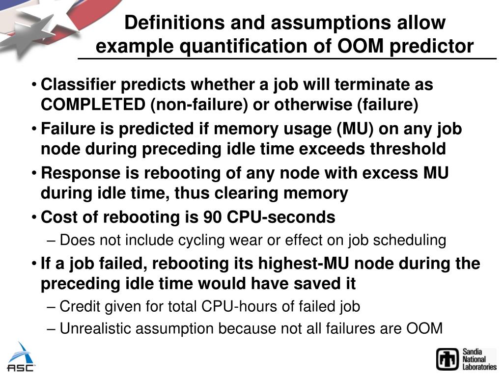 Definitions and assumptions allowexample quantification of OOM predictor • Classifier predicts whether a job will terminate as COMPLETED (non-failure) or otherwise (failure) • Failure is predicted if memory usage (MU) on any job node during preceding idle time exceeds threshold • Response is rebooting of any node with excess MU during idle time, thus clearing memory • Cost of rebooting is 90 CPU-seconds • Does not include cycling wear or effect on job scheduling • If a job failed, rebooting its highest-MU node during the preceding idle time would have saved it • Credit given for total CPU-hours of failed job • Unrealistic assumption because not all failures are OOM