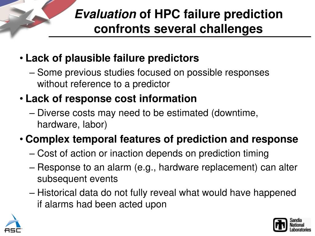 Evaluation of HPC failure predictionconfronts several challenges • Lack of plausible failure predictors • Some previous studies focused on possible responses without reference to a predictor • Lack of response cost information • Diverse costs may need to be estimated (downtime, hardware, labor) • Complex temporal features of prediction and response • Cost of action or inaction depends on prediction timing • Response to an alarm (e.g., hardware replacement) can alter subsequent events • Historical data do not fully reveal what would have happened if alarms had been acted upon
