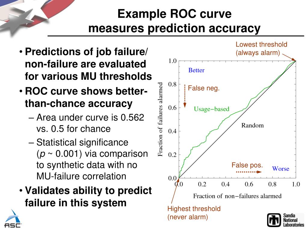 Example ROC curvemeasures prediction accuracy Lowest threshold (always alarm) • Predictions of job failure/non-failure are evaluated for various MU thresholds • ROC curve shows better-than-chance accuracy • Area under curve is 0.562 vs. 0.5 for chance • Statistical significance(p ~ 0.001) via comparison to synthetic data with no MU-failure correlation • Validates ability to predict failure in this system False neg. False pos. Highest threshold (never alarm)