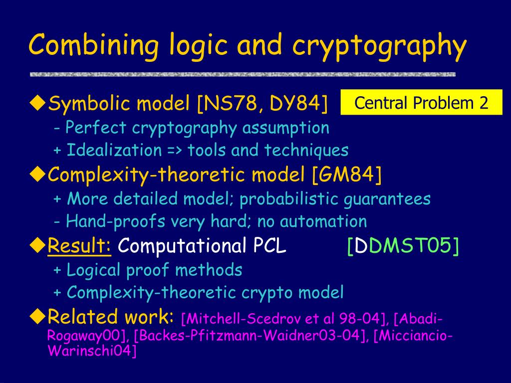 Combining logic and cryptography • Symbolic model [NS78, DY84] - Perfect cryptography assumption + Idealization => tools and techniques • Complexity-theoretic model [GM84] + More detailed model; probabilistic guarantees - Hand-proofs very hard; no automation • Result:Computational PCL[DDMST05] + Logical proof methods + Complexity-theoretic crypto model • Related work: [Mitchell-Scedrov et al 98-04], [Abadi-Rogaway00], [Backes-Pfitzmann-Waidner03-04], [Micciancio-Warinschi04] Central Problem 2