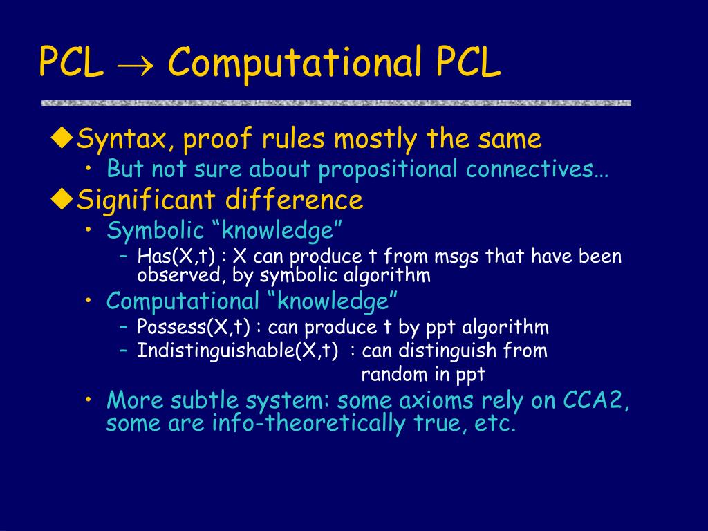PCL Computational PCL • Syntax, proof rules mostly the same • But not sure about propositional connectives… • Significant difference • Symbolic “knowledge” • Has(X,t) : X can produce t from msgs that have been observed, by symbolic algorithm • Computational “knowledge” • Possess(X,t) : can produce t by ppt algorithm • Indistinguishable(X,t) : can distinguish from random in ppt • More subtle system: some axioms rely on CCA2, some are info-theoretically true, etc.