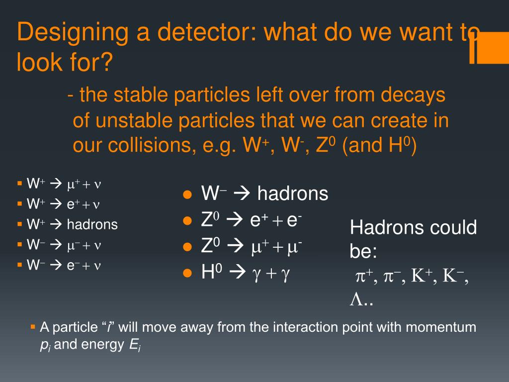 Designing a detector: what do we want to look for?- the stable particles left over from decays of unstable particles that we can create in our collisions, e.g. W+, W-, Z0 (and H0) • W+ m+ + n • W+ e+ +n • W+ hadrons • W- m- + n • W- e- + n • A particle “i” will move away from the interaction point with momentum pi and energy Ei • W- hadrons • Z0 e+ +e- • Z0 m+ +m- • H0 g + g Hadrons could be:p+, p-, K+, K-, L..