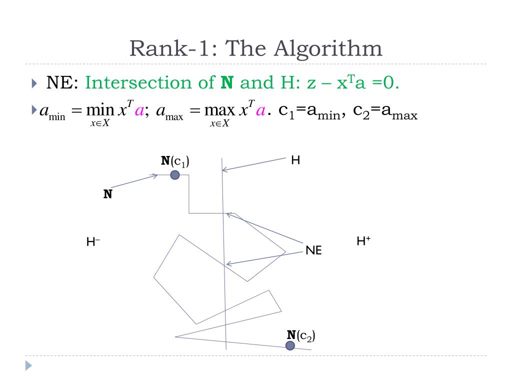 Rank-1: The Algorithm • NE: Intersection of N and H: z – xTa =0. • . c1=amin, c2=amax H N(c1) N H+ H– NE N(c2)