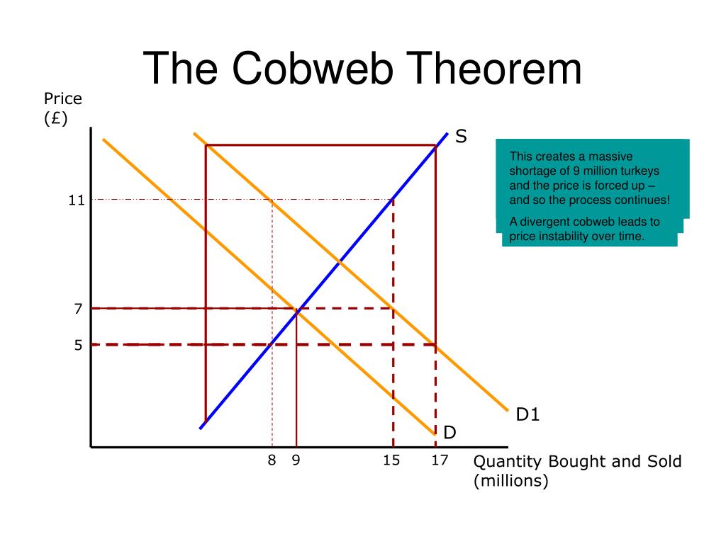 Cobweb Theorem • http://www.bized.co.uk/current/mind/2004_5/251004.ppt • Hungarian-born economist Nicholas Kaldor (1908-1986) • Simple dynamic model of cyclical demand with time lags between the response of production and a change in price (most often seen in agricultural sectors). • Cobweb theory is the process of adjustment in markets • Traces the path of prices and outputs in different equilibrium situations. Path resembles a cobweb with the equilibrium point at the center of the cobweb. • Sometimes referred to as the hog-cycle (after the phenomenon observed in American pig prices during the 1930s).