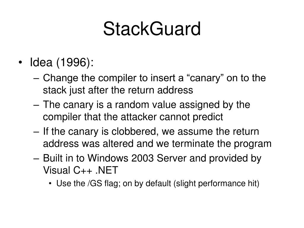 StackGuard • Idea (1996): • Change the compiler to insert a “canary” on to the stack just after the return address • The canary is a random value assigned by the compiler that the attacker cannot predict • If the canary is clobbered, we assume the return address was altered and we terminate the program • Built in to Windows 2003 Server and provided by Visual C++ .NET • Use the /GS flag; on by default (slight performance hit)