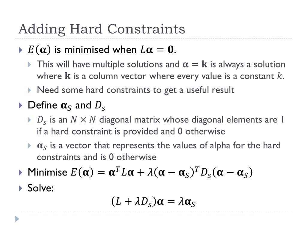 Adding Hard Constraints • is minimised when . • This will have multiple solutions and is always a solution where is a column vector where every value is a constant • Need some hard constraints to get a useful result • Define and • is an diagonal matrix whose diagonal elements are 1 if a hard constraint is provided and 0 otherwise • is a vector that represents the values of alpha for the hard constraints and is 0 otherwise • Minimise • Solve: