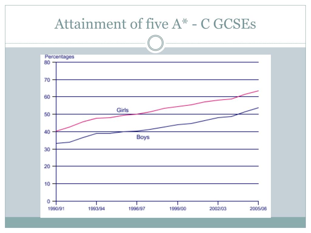 The problem for schools • Until the mid 1980s, boys out-performed girls at all levels of the education system, with the exception of 11+ • Most educational writers read this as being 'proof' that girls were generally less intelligent than boys and that boys were 'late developers'. • Since the mid-1980s both genders began to improve their school performance significantly. The improvement of girls was more rapid than that for boys.