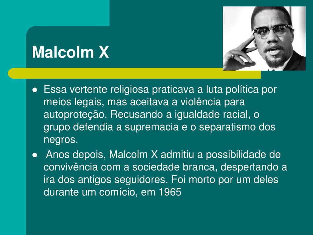 Malcolm X • Essa vertente religiosa praticava a luta política por meios legais, mas aceitava a violência para autoproteção. Recusando a igualdade racial, o grupo defendia a supremacia e o separatismo dos negros. • Anos depois, Malcolm X admitiu a possibilidade de convivência com a sociedade branca, despertando a ira dos antigos seguidores. Foi morto por um deles durante um comício, em 1965