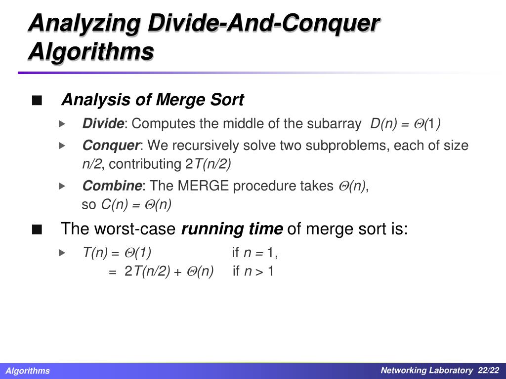 Analyzing Divide-And-Conquer Algorithms • Analysis of Merge Sort • Divide: Computes the middle of the subarray D(n) = (1) • Conquer: We recursively solve two subproblems, each of size n/2, contributing 2T(n/2) • Combine: The MERGE procedure takes (n), so C(n) = (n) • The worst-case running time of merge sort is: • T(n) =(1) if n = 1, = 2T(n/2) + (n) if n > 1