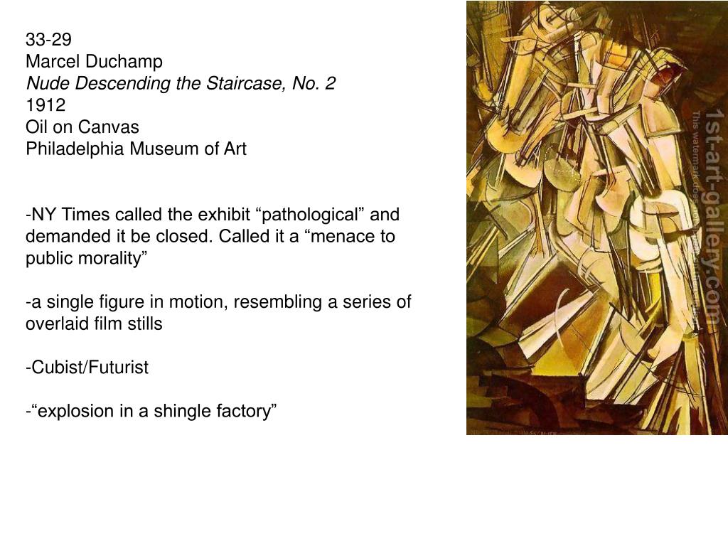 33-29 Marcel Duchamp Nude Descending the Staircase, No. 2 1912 Oil on Canvas Philadelphia Museum of Art -NY Times called the exhibit “pathological” and demanded it be closed. Called it a “menace to public morality” -a single figure in motion, resembling a series of overlaid film stills -Cubist/Futurist • “explosion in a shingle factory”