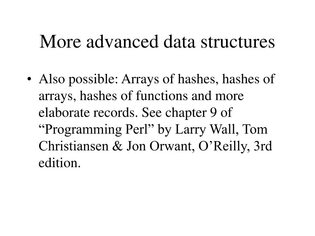 More advanced data structures • Also possible: Arrays of hashes, hashes of arrays, hashes of functions and more elaborate records. See chapter 9 of “Programming Perl” by Larry Wall, Tom Christiansen & Jon Orwant, O’Reilly, 3rd edition.