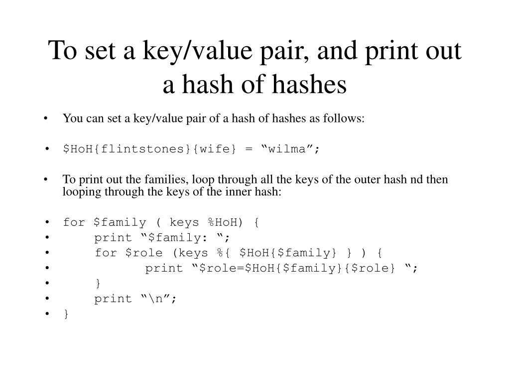 To set a key/value pair, and print out a hash of hashes • You can set a key/value pair of a hash of hashes as follows: • $HoH{flintstones}{wife} = “wilma”; • To print out the families, loop through all the keys of the outer hash nd then looping through the keys of the inner hash: • for $family ( keys %HoH) { • print “$family: “; • for $role (keys %{ $HoH{$family} } ) { • print “$role=$HoH{$family}{$role} “; • } • print “\n”; • }