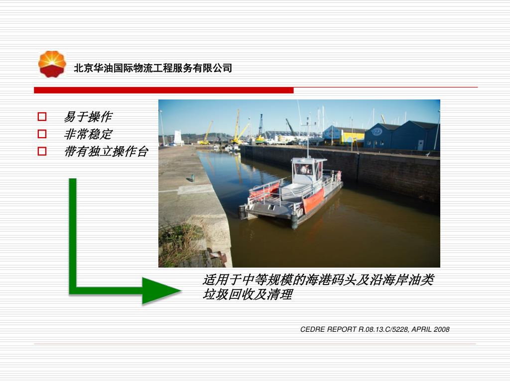 北京华油国际物流工程服务有限公司 • 易于操作 • 非常稳定 • 带有独立操作台 适用于中等规模的海港码头及沿海岸油类垃圾回收及清理 CEDRE REPORT R.08.13.C/5228, APRIL 2008
