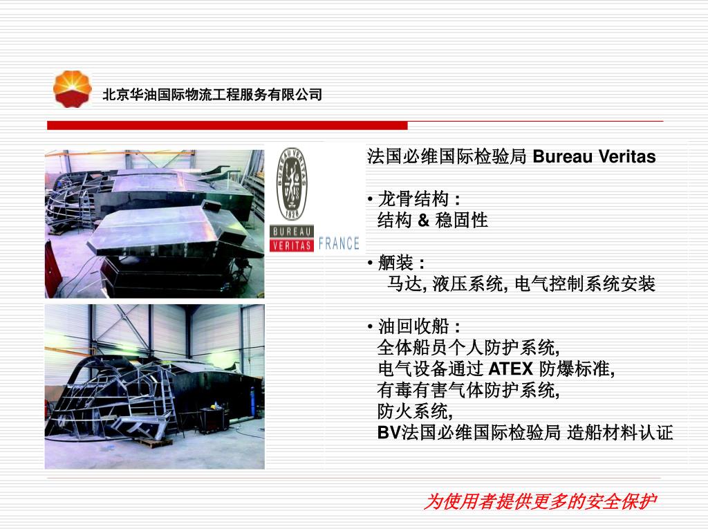 北京华油国际物流工程服务有限公司 • 法国必维国际检验局 Bureau Veritas • 龙骨结构 : • 结构 & 稳固性 • 舾装 : • 马达, 液压系统, 电气控制系统安装 • 油回收船 : • 全体船员个人防护系统, • 电气设备通过 ATEX 防爆标准, • 有毒有害气体防护系统, • 防火系统, • BV法国必维国际检验局 造船材料认证 为使用者提供更多的安全保护