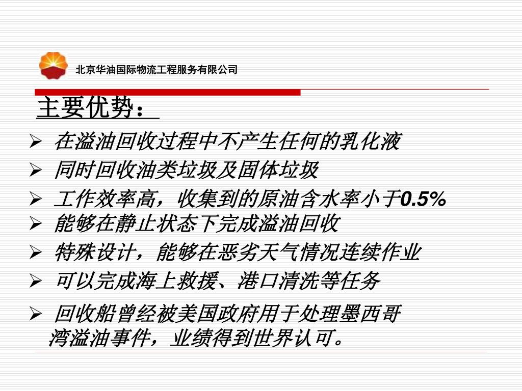 北京华油国际物流工程服务有限公司 主要优势: • 在溢油回收过程中不产生任何的乳化液 • 同时回收油类垃圾及固体垃圾 • 工作效率高,收集到的原油含水率小于0.5% • 能够在静止状态下完成溢油回收 • 特殊设计,能够在恶劣天气情况连续作业 • 可以完成海上救援、港口清洗等任务 • 回收船曾经被美国政府用于处理墨西哥湾溢油事件,业绩得到世界认可。