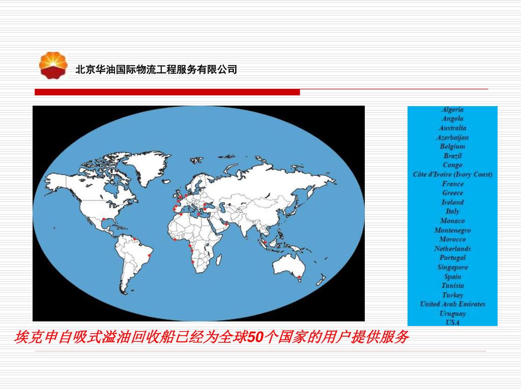 北京华油国际物流工程服务有限公司 埃克申自吸式溢油回收船已经为全球50个国家的用户提供服务