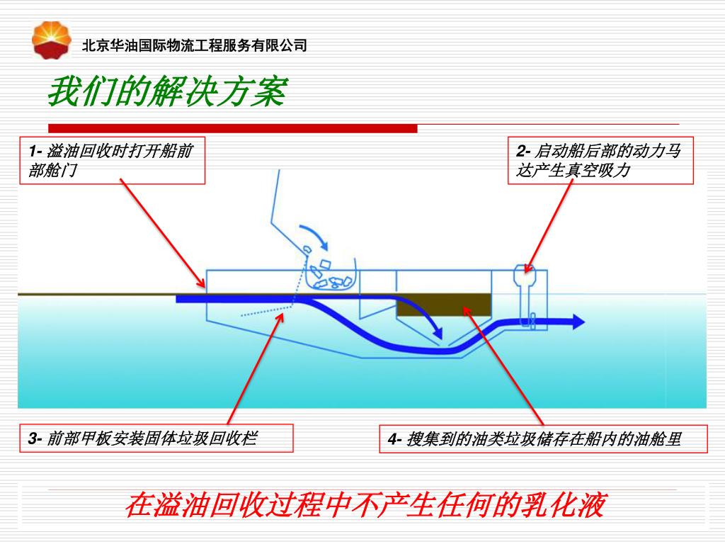 北京华油国际物流工程服务有限公司 我们的解决方案 2- 启动船后部的动力马达产生真空吸力 1- 溢油回收时打开船前部舱门 4- 搜集到的油类垃圾储存在船内的油舱里 3- 前部甲板安装固体垃圾回收栏 在溢油回收过程中不产生任何的乳化液