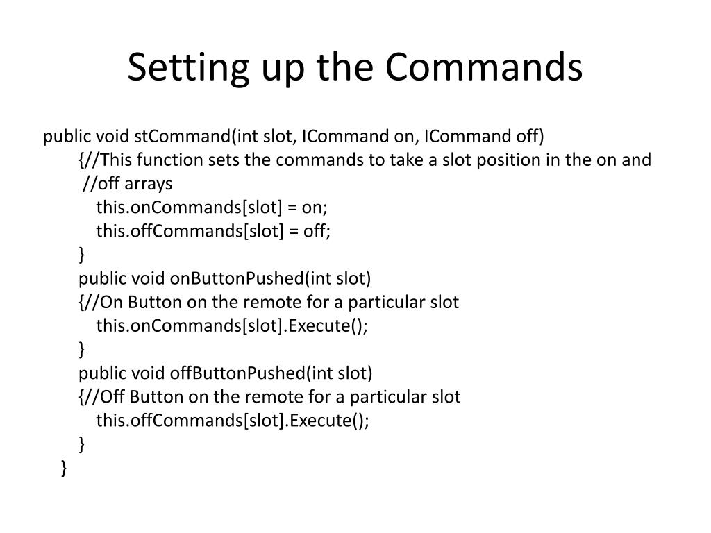 Setting up the Commands public void stCommand(int slot, ICommand on, ICommand off) {//This function sets the commands to take a slot position in the on and //off arrays this.onCommands[slot] = on; this.offCommands[slot] = off; } public void onButtonPushed(int slot) {//On Button on the remote for a particular slot this.onCommands[slot].Execute(); } public void offButtonPushed(int slot) {//Off Button on the remote for a particular slot this.offCommands[slot].Execute(); } }
