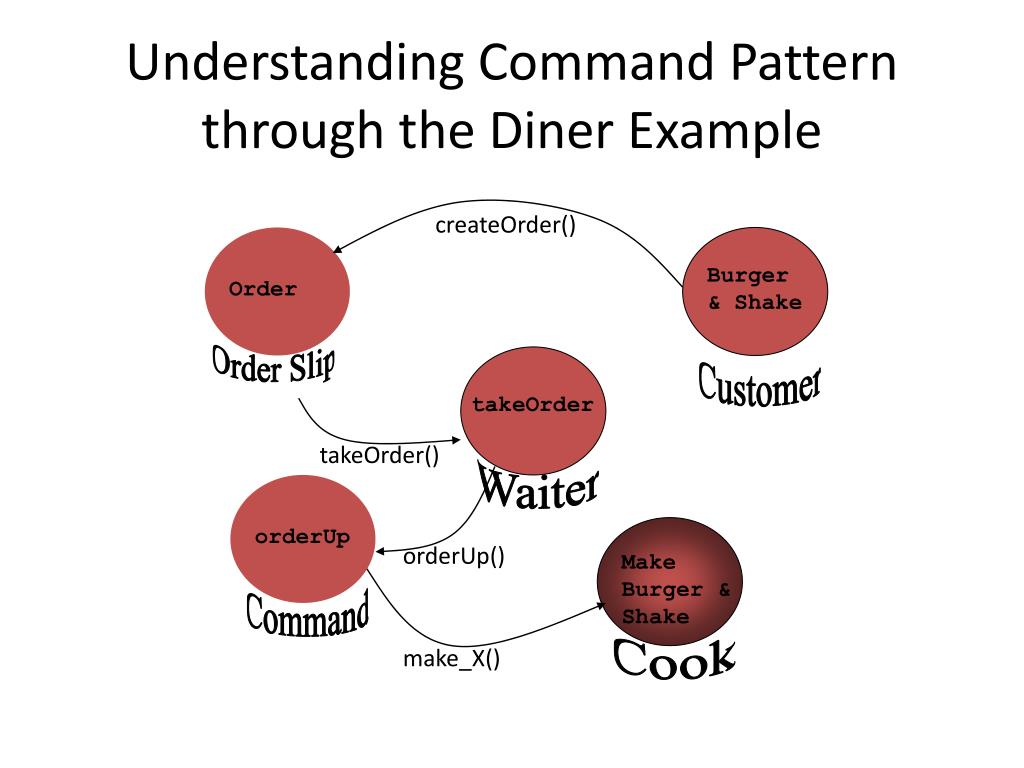 Order orderUp takeOrder Make Burger & Shake Understanding Command Pattern through the Diner Example createOrder() Burger & Shake Order Slip Customer takeOrder() Waiter orderUp() Command Cook make_X()