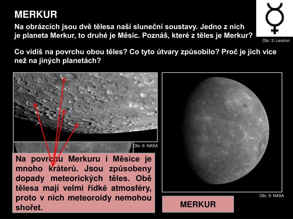 MERKUR Na obrázcích jsou dvě tělesa naší sluneční soustavy. Jedno z nich je planeta Merkur, to druhé je Měsíc. Poznáš, které z těles je Merkur? Obr. 3: Lexicon Co vidíš na povrchu obou těles? Co tyto útvary způsobilo? Proč je jich více než na jiných planetách? Obr. 6: NASA Na povrchu Merkuru i Měsíce je mnoho kráterů. Jsou způsobeny dopady meteorických těles. Obě tělesa mají velmi řídké atmosféry, proto v nich meteoroidy nemohou shořet. Obr. 4: Pringles Obr. 5: NASA MĚSÍC MERKUR