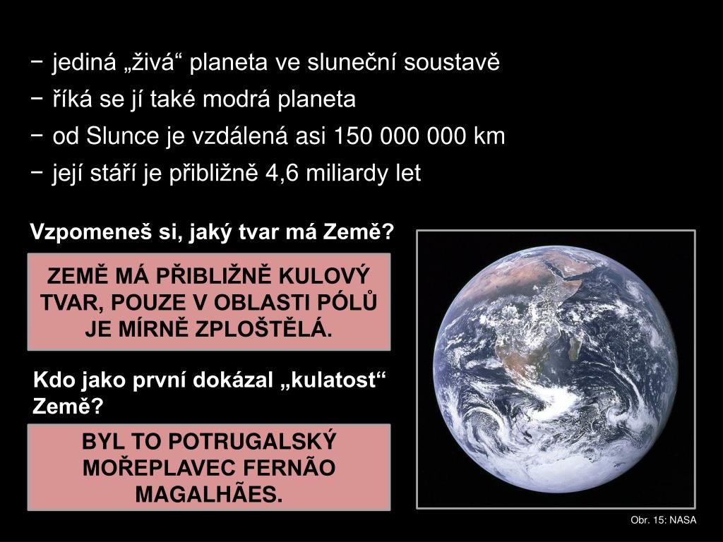 jediná „živá“ planeta ve sluneční soustavě • říká se jí také modrá planeta • od Slunce je vzdálená asi 150 000 000 km • její stáří je přibližně 4,6 miliardy let Vzpomeneš si, jaký tvar má Země? ZEMĚ MÁ PŘIBLIŽNĚ KULOVÝ TVAR, POUZE V OBLASTI PÓLŮ JE MÍRNĚ ZPLOŠTĚLÁ. Kdo jako první dokázal „kulatost“ Země? BYL TO POTRUGALSKÝ MOŘEPLAVEC FERNÃO MAGALHÃES. Obr. 15: NASA