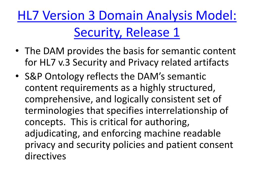 HL7 Version 3 Domain Analysis Model: Security, Release 1 • The DAM provides the basis for semantic content for HL7 v.3 Security and Privacy related artifacts • S&P Ontology reflects the DAM’s semantic content requirements as a highly structured, comprehensive, and logically consistent set of terminologies that specifies interrelationship of concepts. This is critical for authoring, adjudicating, and enforcing machine readable privacy and security policies and patient consent directives