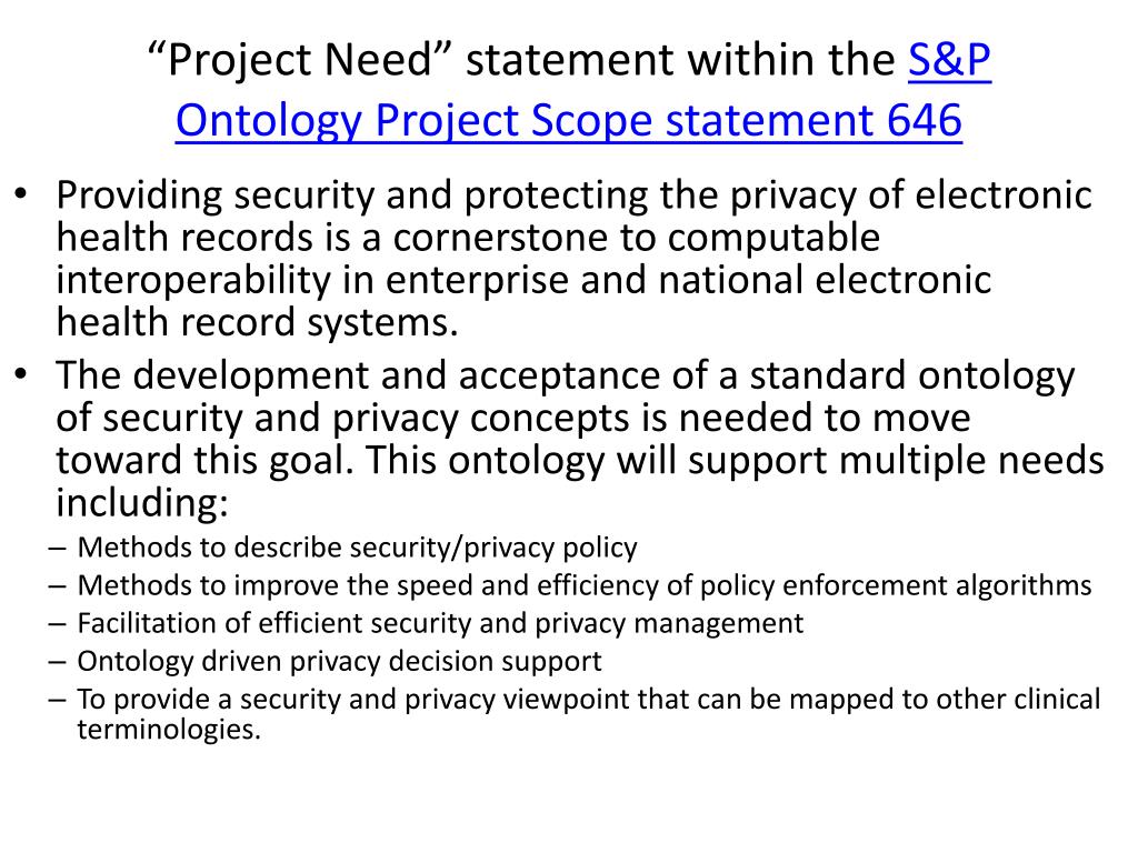 “Project Need” statement within the S&P Ontology Project Scope statement 646 • Providing security and protecting the privacy of electronic health records is a cornerstone to computable interoperability in enterprise and national electronic health record systems. • The development and acceptance of a standard ontology of security and privacy concepts is needed to move toward this goal. This ontology will support multiple needs including: • Methods to describe security/privacy policy • Methods to improve the speed and efficiency of policy enforcement algorithms • Facilitation of efficient security and privacy management • Ontology driven privacy decision support • To provide a security and privacy viewpoint that can be mapped to other clinical terminologies.