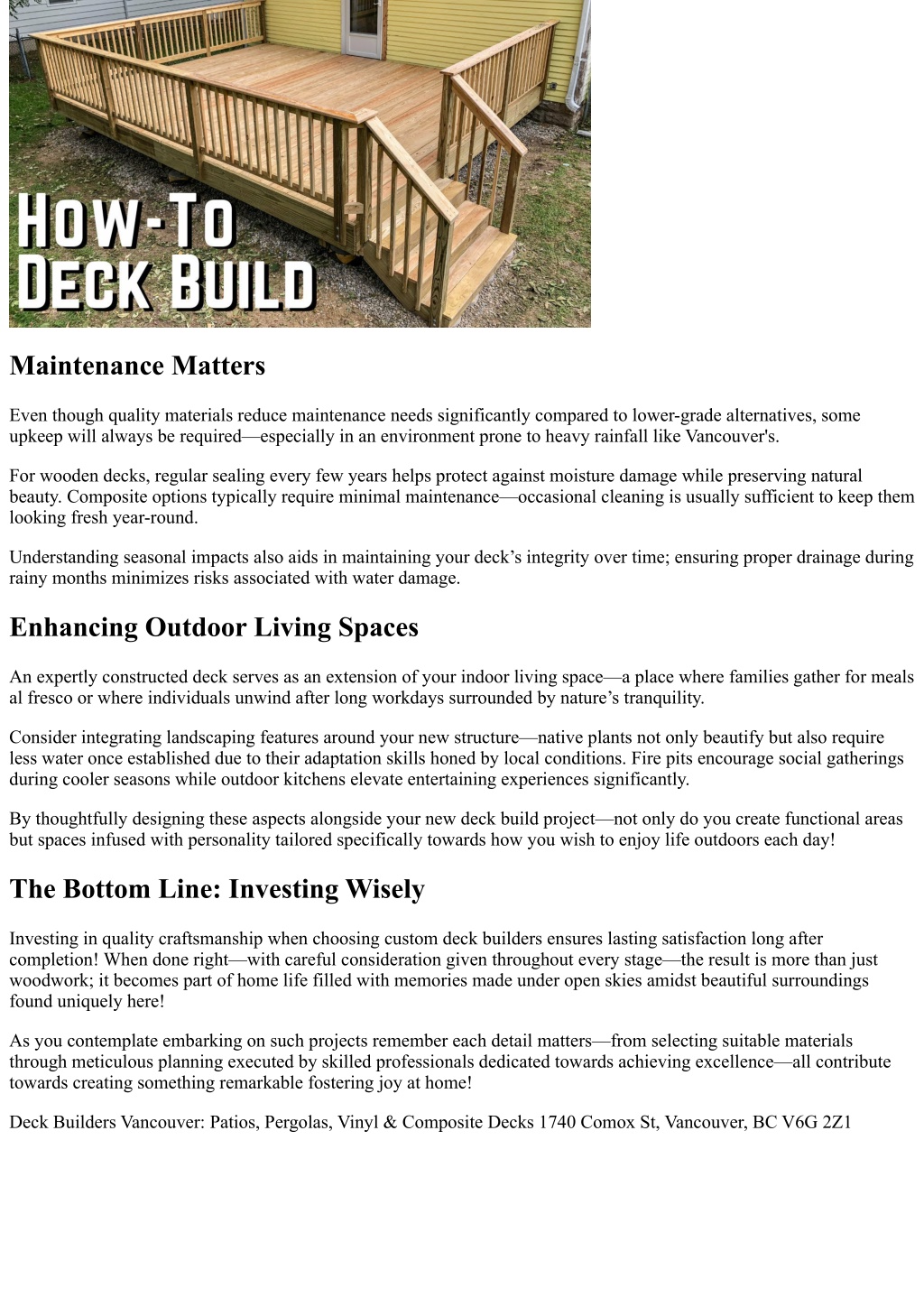 Maintenance Matters Even though quality materials reduce maintenance needs significantly compared to lower-grade alternatives, some upkeep will always be required—especially in an environment prone to heavy rainfall like Vancouver's. For wooden decks, regular sealing every few years helps protect against moisture damage while preserving natural beauty. Composite options typically require minimal maintenance—occasional cleaning is usually sufficient to keep them looking fresh year-round. Understanding seasonal impacts also aids in maintaining your deck’s integrity over time; ensuring proper drainage during rainy months minimizes risks associated with water damage. Enhancing Outdoor Living Spaces An expertly constructed deck serves as an extension of your indoor living space—a place where families gather for meals al fresco or where individuals unwind after long workdays surrounded by nature’s tranquility. Consider integrating landscaping features around your new structure—native plants not only beautify but also require less water once established due to their adaptation skills honed by local conditions. Fire pits encourage social gatherings during cooler seasons while outdoor kitchens elevate entertaining experiences significantly. By thoughtfully designing these aspects alongside your new deck build project—not only do you create functional areas but spaces infused with personality tailored specifically towards how you wish to enjoy life outdoors each day! The Bottom Line: Investing Wisely Investing in quality craftsmanship when choosing custom deck builders ensures lasting satisfaction long after completion! When done right—with careful consideration given throughout every stage—the result is more than just woodwork; it becomes part of home life filled with memories made under open skies amidst beautiful surroundings found uniquely here! As you contemplate embarking on such projects remember each detail matters—from selecting suitable materials through meticulous planning executed by skilled professionals dedicated towards achieving excellence—all contribute towards creating something remarkable fostering joy at home! Deck Builders Vancouver: Patios, Pergolas, Vinyl & Composite Decks 1740 Comox St, Vancouver, BC V6G 2Z1