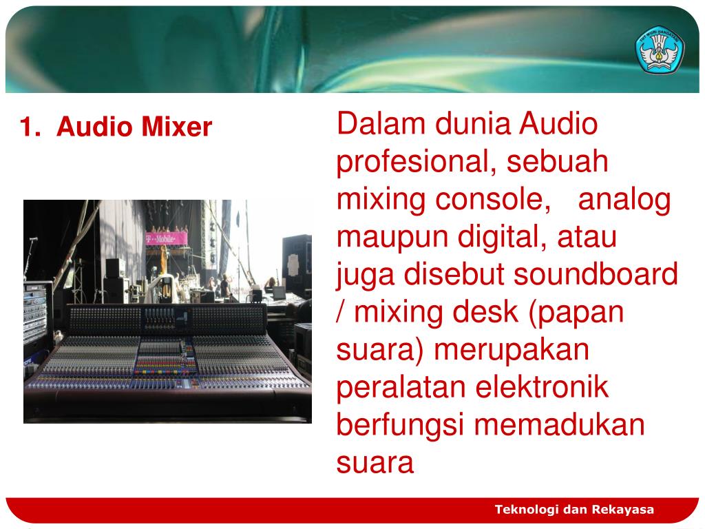 Dalam dunia Audio profesional, sebuah mixing console, analog maupun digital, atau juga disebut soundboard / mixing desk (papan suara) merupakanperalatan elektronik berfungsi memadukansuara 1. Audio Mixer Teknologi dan Rekayasa