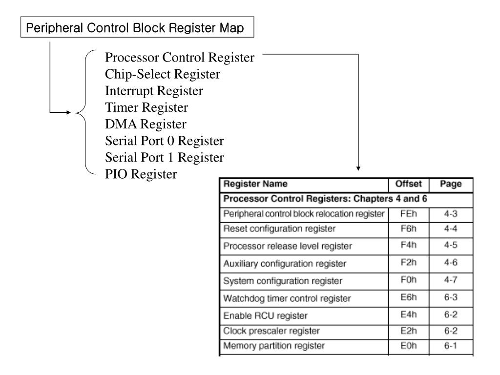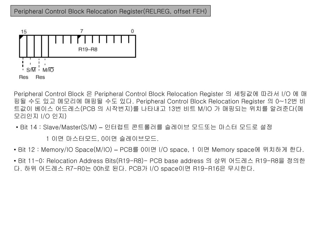 Peripheral Control Block Relocation Register(RELREG, offset FEH) Peripheral Control Block 은 Peripheral Control Block Relocation Register 의 세팅값에 따라서 I/O 에 매핑될 수도 있고 메모리에 매핑될 수도 있다. Peripheral Control Block Relocation Register 의 0~12번 비트값이 베이스 어드레스(PCB 의 시작번지)를 나타내고 13번 비트 M/IO 가 매핑되는 위치를 알려준다(메모리인지 I/O 인지) • Bit 14 : Slave/Master(S/M) –인터럽트 콘트롤러를 슬레이브 모드또는 마스터 모드로 설정 1 이면 마스터모드, 0이면 슬레이브모드. • Bit 12 : Memory/IO Space(M/IO) – PCB를 0이면 I/O space, 1 이면 Memory space에 위치하게 한다. • Bit 11-0: Relocation Address Bits(R19-R8)- PCB base address 의 상위 어드레스 R19-R8을 정의한다. 하위 어드레스 R7-R0는 00h로 된다. PCB가 I/O space이면 R19-R16은 무시한다.